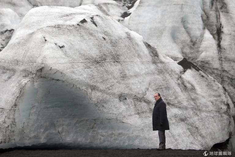 法國總統歐蘭德(Francois Hollande)沿著冰川散步,他所在的冰川已經往後退了超過 1公里。歐蘭德這次到冰島參訪,是為了親身體驗全球暖化造成的傷害有多大。法國即將在 11月底舉辦第 21屆聯合國氣候變遷大會(COP21),討論氣候變遷問題。