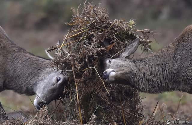年輕公鹿互相用鹿角衝撞對方。每年秋天是英國紅鹿(Red deer)的繁殖季,牠們會在這時候發情,大型的雄鹿互相吼叫打架,用頭上的鹿角撞其他追求者,證明自己身強體壯,來吸引更多的雌性交配。