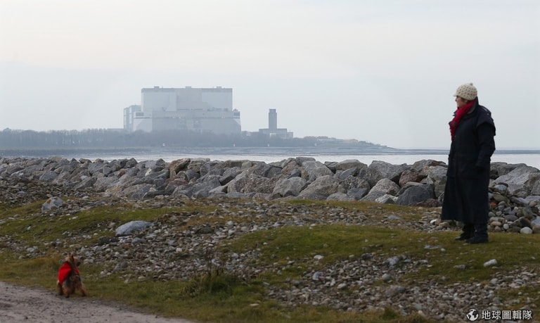 一名女子帶著狗兒遙望遠方的欣克利角核電廠。中國在英國不只投資核電廠,在電信、鐵路等基礎建設上也想參一腳。