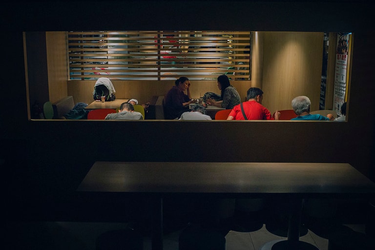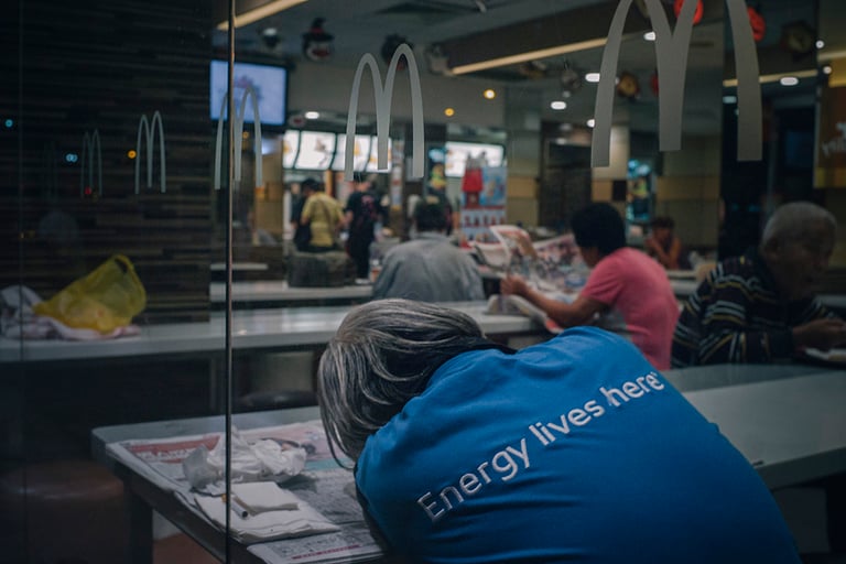 凌晨兩點,荃灣沙咀道麥當勞。推了一架手推車舊報紙來的大叔,枱上放了杯麥當勞紙杯盛的水和一台舊式體積很大的收音機,他邊看那份發黃報紙邊以專家的口吻說:「他每天工時很長,下班就來睡幾小時,不要吵醒他,很可憐啊。」