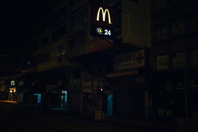 凌晨三點半,深水埗元洲街麥當勞,老婆婆用黑色垃圾袋包着上身,倚伴玻璃而睡,在店外看,她的臉壓在玻璃上和「10元超值選」魚柳飽的廣告牌在一起。這店在街角,老住宅區晚上都關了燈,只有它燈火通明,招牌上的M字特別耀眼。