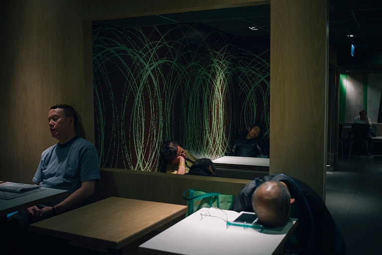 右邊是非正式的睡眠區,每天這個時候都有十多二十人在卡座或是連放在一起的椅上睡着。時間還早,播放的陳奕迅新歌《起點‧終站》有點吵耳,當中兩、三個人似是仍睡不着,在看報紙和戴上耳筒看手機中的電視節目。穿梭左右兩邊世界的是一位老清潔女工,吃的不會到右邊,睡的不會到左邊,各不打擾,一切也似有默契。