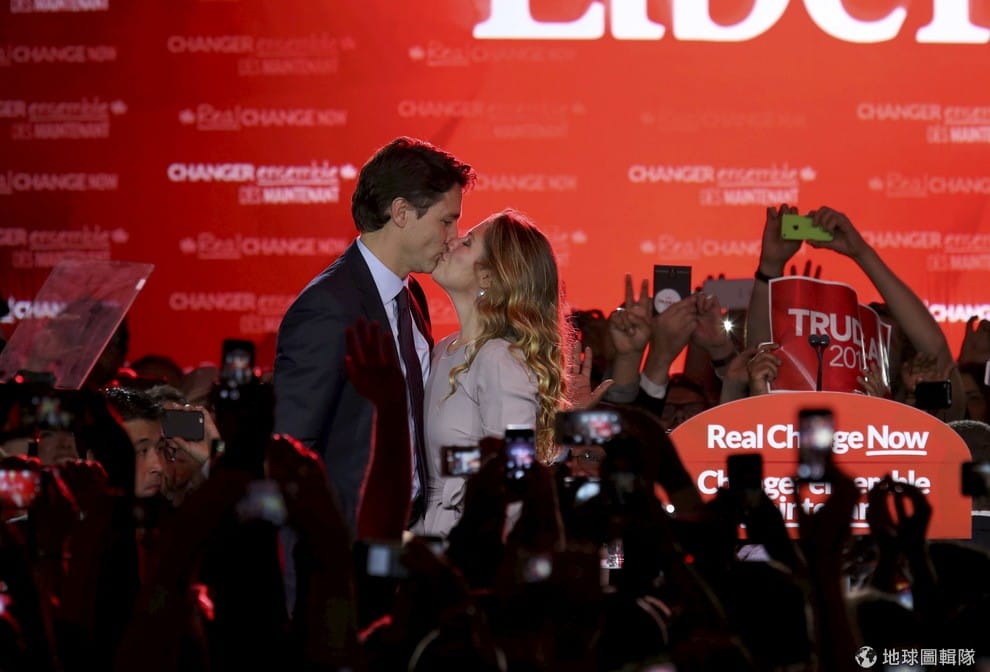 杜魯道(Justin Trudeau)親吻著太太格高蕾(Sophie Gregoire)。加拿大選舉剛落幕,自由黨的杜魯道打敗現任總理哈珀(Stephen Harper)贏得這次大選,成為下任加拿大總理。外界形容杜魯道是個有著英俊外表的帥哥,但他因為年輕與出身權貴,一開始並不被看好,是靠著自身幽默與機智才終於逆轉當上總理。