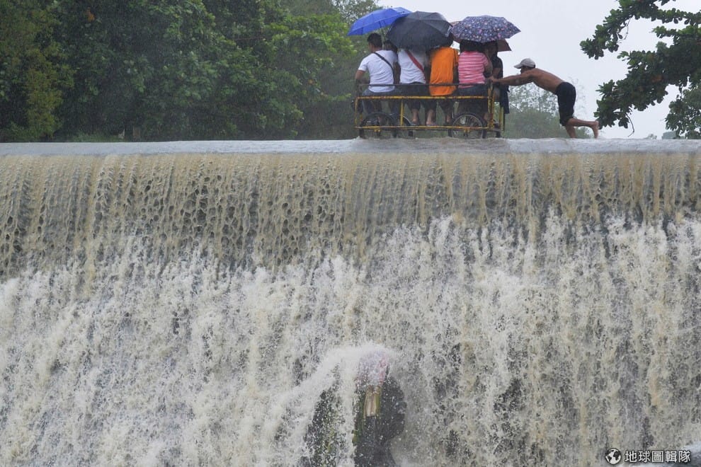 巨爵颱風帶來的大水沖下水壩,菲律賓居民們正撐著傘跨過水壩。巨爵颱風橫掃菲律賓北部,樹木、電線桿和牆壁都被風吹倒,大水也淹過了河床,估計至少有 9人在風災中死亡,幸運的是,有數萬居民及時撤退逃過風災。