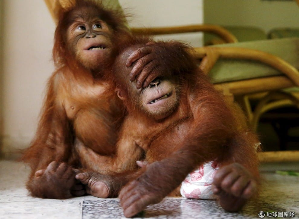 吉隆坡的野生動植物部門裡,2隻小蘇門答臘猩猩(Sumatran orangutan)抱在一起玩耍。大馬野生動植物部門從非法販子的袋子裡,找到 2隻蘇門答臘猩猩,阻止他把小猩猩賣到馬來西亞。根據當地媒體報導,小猩猩會被送回他們在印尼的家。根據野生動植物交易監管組織TRAFFIC調查,全球的野生動植物非法交易價值一年將近 80億美元(折台幣 2,584億)。