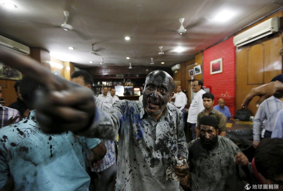 記者會上,喀什米爾議員拉席(Sheikh Abdul Rashid)滿臉都是黑色油漆和油墨。今年 10月,拉席在印度斯利那加市(Srinagar)的政府大樓供應牛肉,因此引起印度右派組織「印度錫那」(Hindu Sena)不滿,往他身上潑黑油漆和油墨。