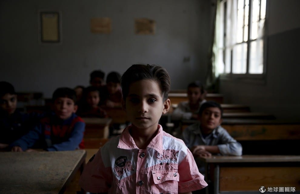 敘利亞反政府軍控制的學校裡,小朋友們坐在教室裡看向鏡頭。新學年早該開始,但大馬士革東歌塔區(Gouta)的開學時間卻不斷延後,因為效忠敘利亞總統阿薩德(Bashar al-Assad)的軍隊不斷空襲,使得學校只好延後開學。