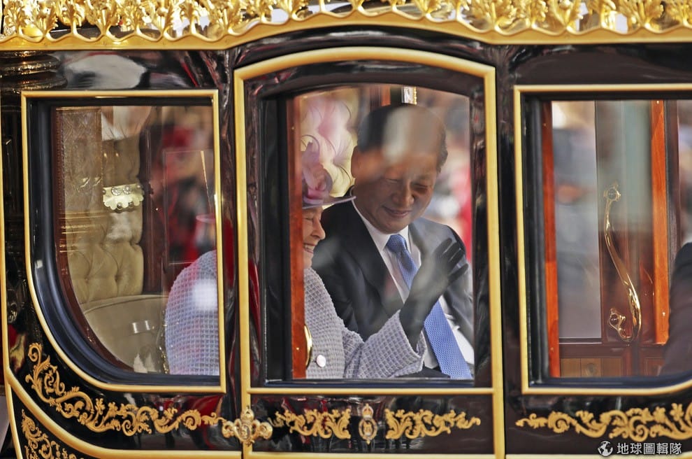 英國女王伊莉莎白二世(左,Queen Elizabeth)跟中國領導人習近平搭著馬車,前往白金漢宮。中國領導人習近平飛往英國,展開為期四天的出訪行程。他與第一夫人彭麗媛下榻在白金漢宮,接受英國女王伊莉莎白二世的款待,緊接著與英國首相卡麥隆(David Cameron)見面,敲定 150項中英合作案。