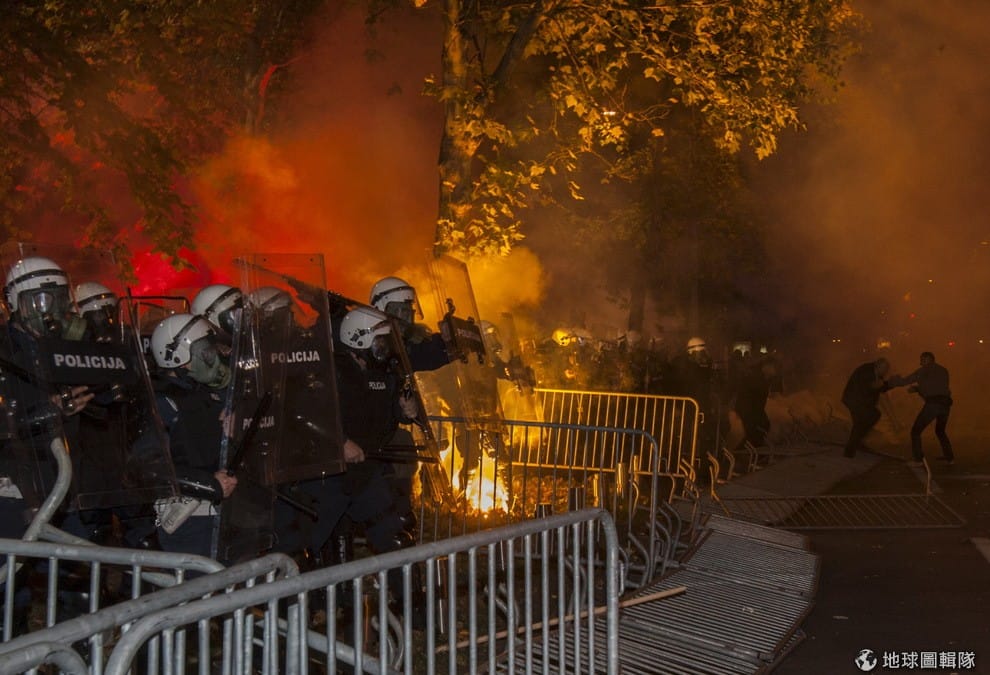 鎮暴警察一手拿著盾牌,一手朝著抗議民眾投擲催淚瓦斯,希望驅離群聚於議會大廈前的 5千名示威民眾。近日,大批民眾走上街頭,要求執政超過 20年的總理久卡諾維奇(Milo Djukanovic)下台換人做。