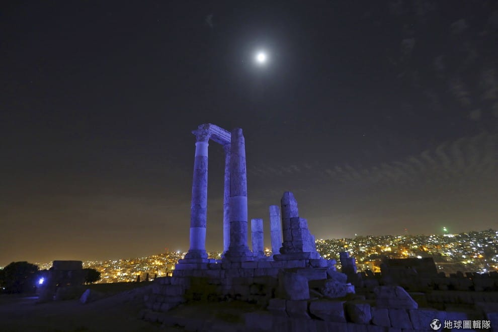 一輪明月照著散發著藍光的海克力斯神廟,目的是要紀念聯合國成立 70周年。根據聯合國網站,1945年10月24日,當時的安理會五大常任理事國(法國、中國、蘇聯、英國和美國)及多數其他簽署國(46國)共同批准了憲章,聯合國正式宣告成立,至今已有 193個成員國。