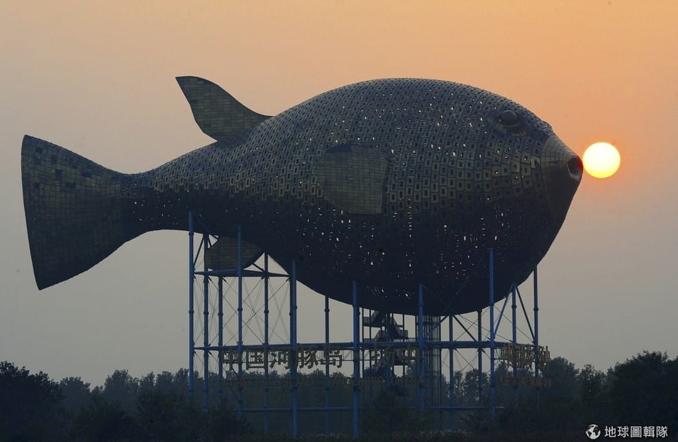 一輪落日緩緩下沉,正好落在大型河豚雕塑的嘴旁,看起來就像一隻大河豚在親吻太陽。這座高度大約 15層樓的大河豚雕塑坐落於江蘇省,共花了 8,920塊銅板,將近 7千萬人民幣(折台幣約 3億6,008萬元)打造而成,目的是為了推廣被稱為「中國河豚島」的揚中區域。