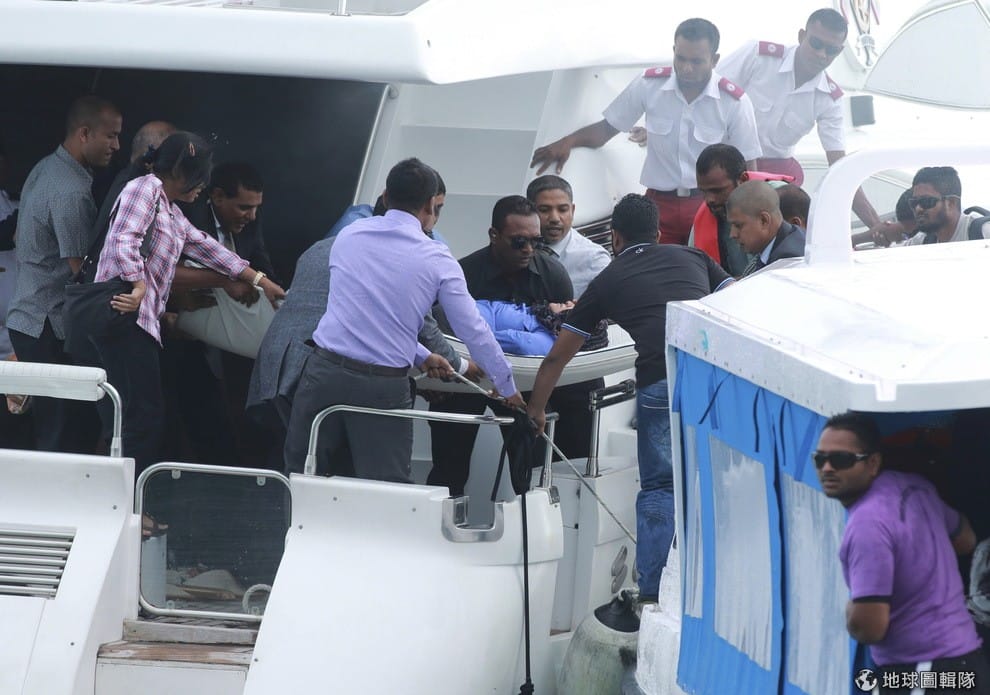9月28日時,抵達馬爾地夫碼頭的總統船隻傳出爆炸,當時剛好不在座位上的總統雅門沒有受傷,但第一夫人以及兩位乘客受到波及。事後調查指出是有人在總統座椅下放置爆裂物。圖為當時緊急將傷患送往醫院的人員。