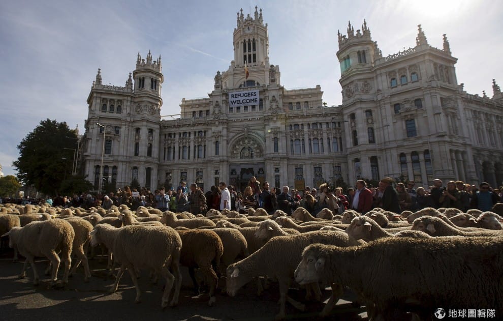 一年一度的馬德里綿羊遊行盛大展開,大約 2千隻美麗諾綿羊出現在大街上,引發沿途民眾圍觀,綿羊身後的建築物上掛著一張寫著「歡迎難民」的牌子。每年,牧羊人都會帶著他們的羊群逛大街,藉此來行使他們從古至今被賦予的路權,也就是可以循著傳統的牧羊路徑,在冬季一路從西班牙北部的牧場往南邊移動。