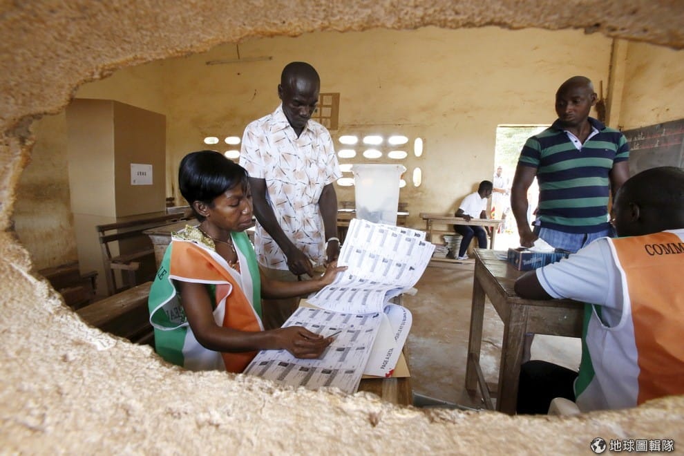 時值總統大選,開票所的選務人員正在協助民眾投票。穿著綠色條紋上衣的男子領了票後,到選務人員面前投下了他神聖的一票。