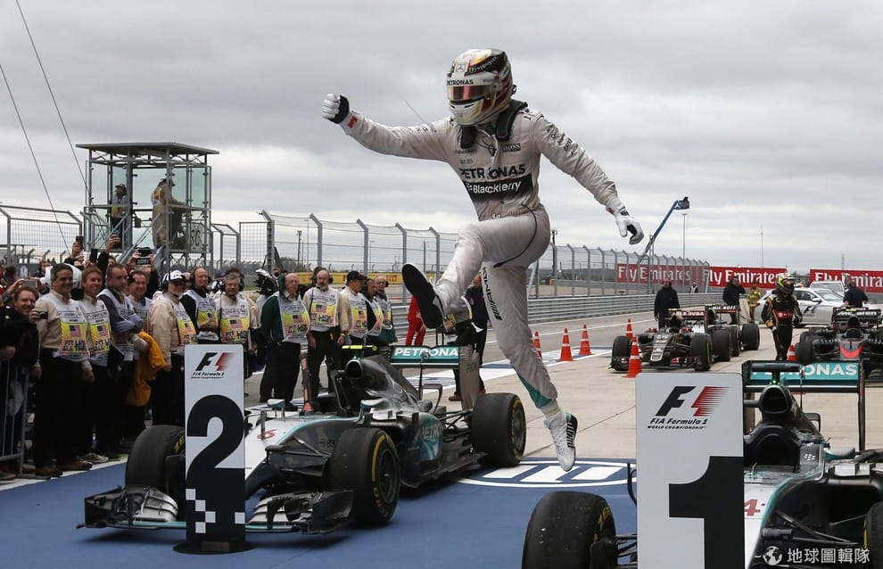 英國一級方程式賽車手漢米爾頓(Lewis Hamilton)一舉奪下今年的美國大獎賽(U.S. F1 Grand Prix),他開心地跳起來,這已經是漢米爾頓第三次奪下國際賽車大獎賽冠軍。