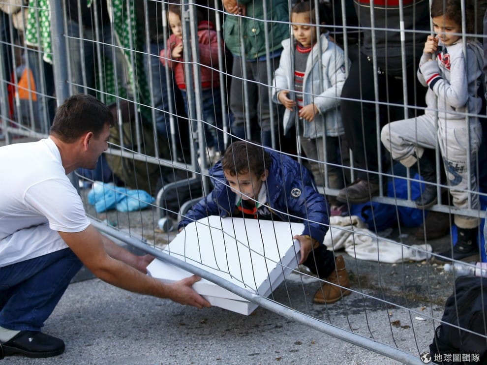 一名難民小男孩鑽過斯洛維尼亞和奧地利之間的邊界,開心地抱著男子送的披薩準備回去大吃一頓。眼看冬天即將來臨,來自敘利亞的難民依然源源不絕湧入歐洲,斯洛維尼亞總理采拉爾(Miro Cerar)表示,斯洛維尼亞這個位於阿爾卑斯山的小國已經快要招架不住難民,過去 10天來有 6萬人入境,歐盟卻沒有提供足夠的幫忙,再這樣下去不要多久「歐盟還有整個歐洲會開始瓦解」。