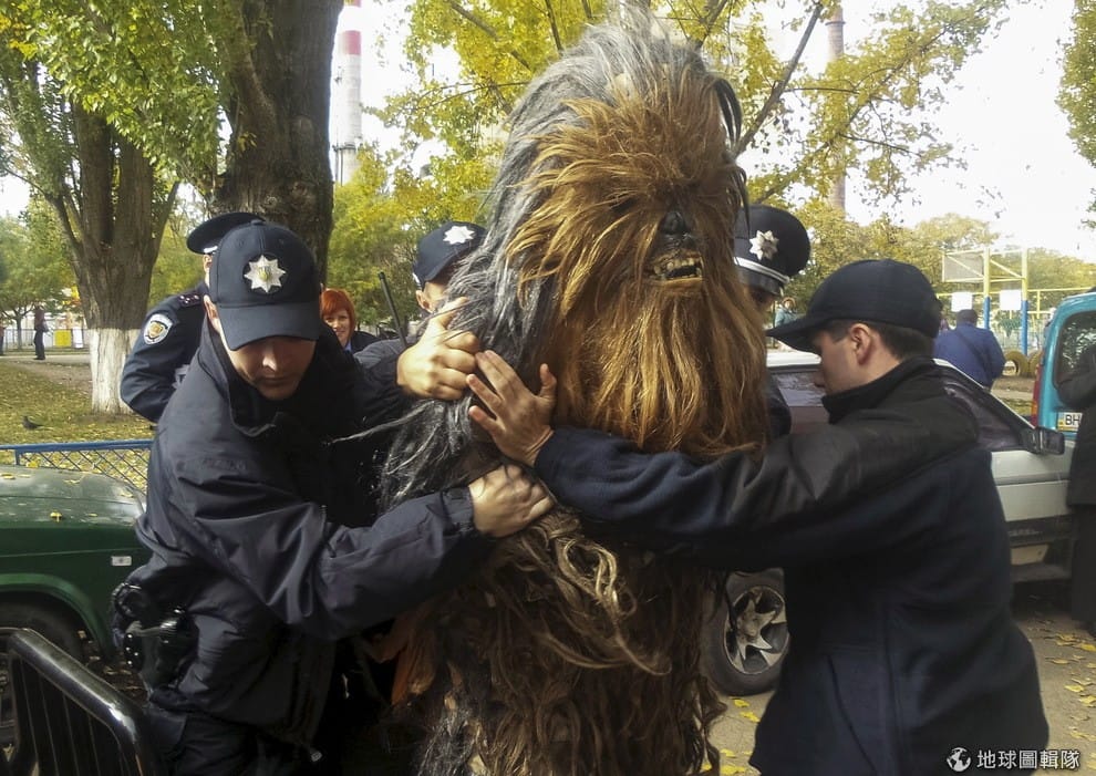 一群警察合力制伏了穿著《星際大戰》中丘巴卡(Chewbacca, 港譯為楚霸客)服裝的男子。警方表示,該名男子違反了投票日當天不能助選的規定,妨礙民眾選出市長和議員。