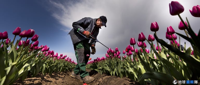 正在專心採下鬱金香花朵的農人。圖片來源:Carsten Koall/Getty Images