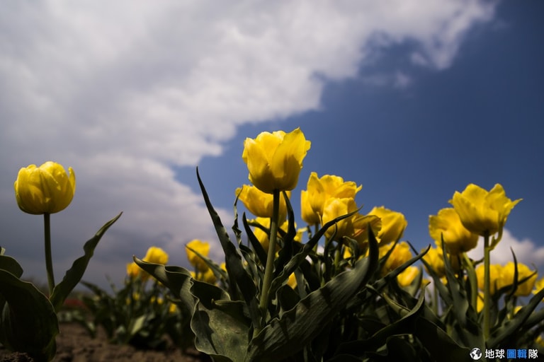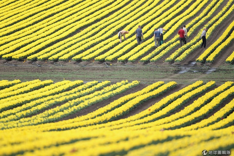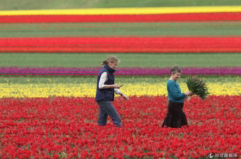 從鬱金香花叢中遠看專心採花的農人。圖片來源:Carsten Koall/Getty Images