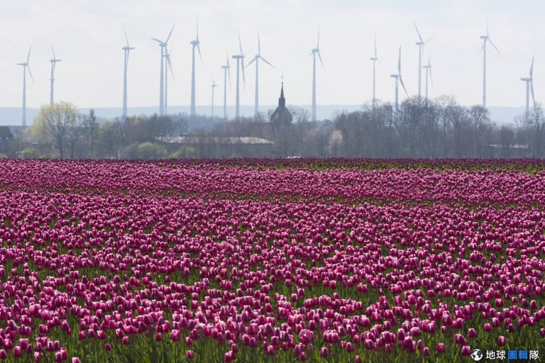 遠望風車以及前方的粉紅色鬱金香花田。圖片來源:Carsten Koall/Getty Images