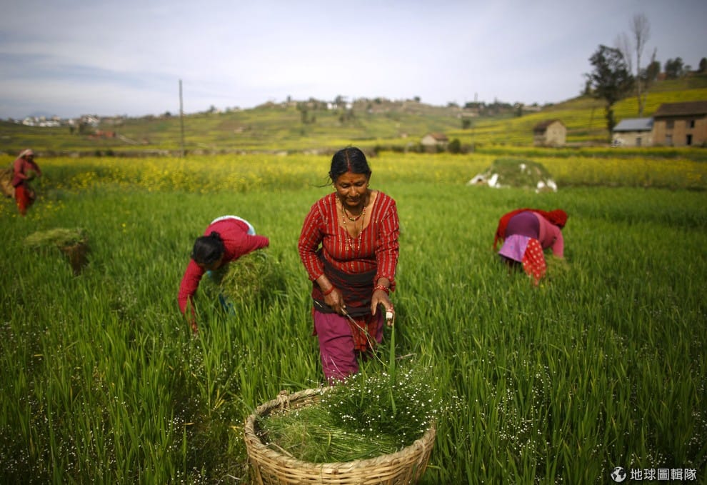 尼泊爾女人們在農地裡收割牧草,準備待會拿去餵牛。