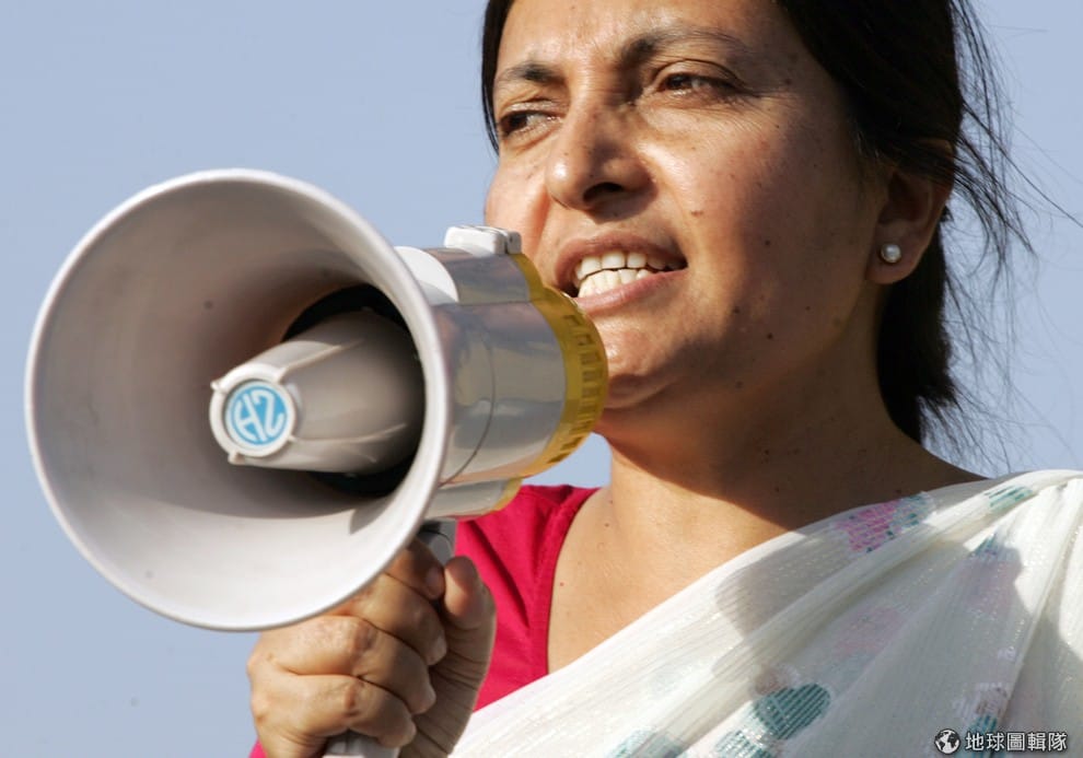 尼泊爾新任總統班達里的演說能力備受肯定,圖為 2006年她拿著大聲公要求增加女性參與修憲委員會的畫面。