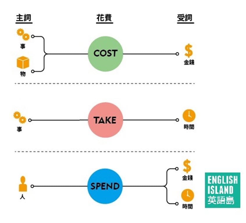 Spend、cost、take 這三個動詞用法常會搞混,是因為中文都翻成「花…」,可以是花時間或花錢。簡單來說,這三個字的用法可依主詞是人還是物,以及是用於花時間或花金錢,來歸納成以下圖表: