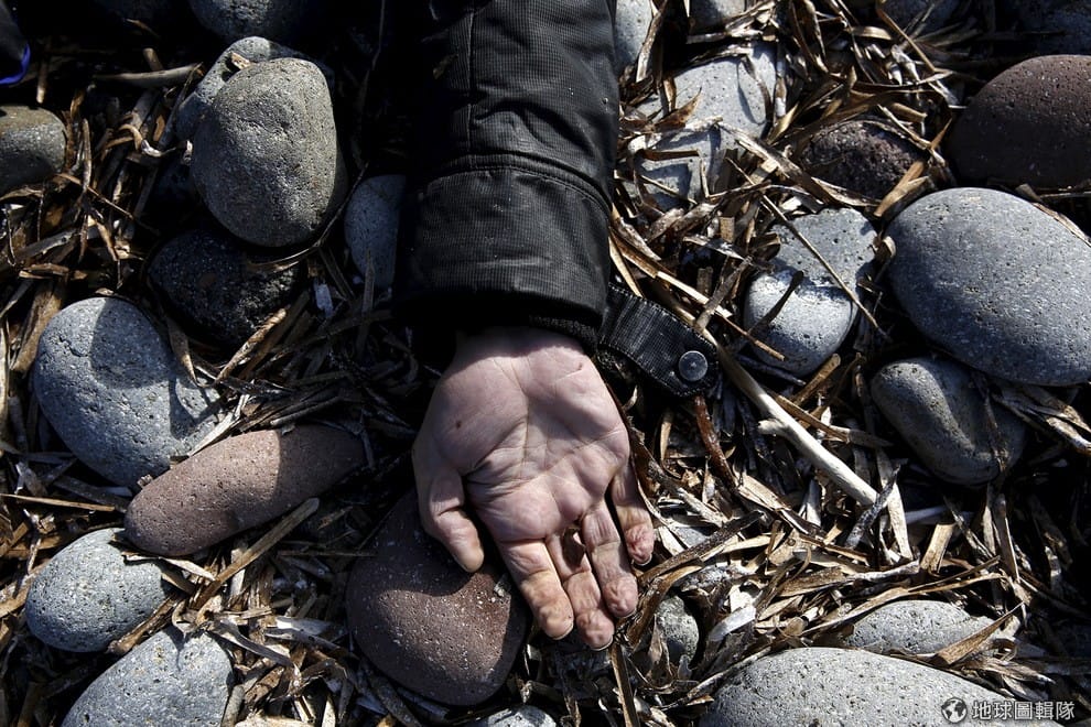 泡到皺且毫無血色的手倒在希臘第三大島列斯伏斯(Lesbos)的岸邊,這隻手來自一名溺水的難民。隨著時序邁入冬天,越來越多難民在橫渡愛琴海時因為海相不佳而溺死,原本平靜的蔚藍海面瞬間變成海上墳場。