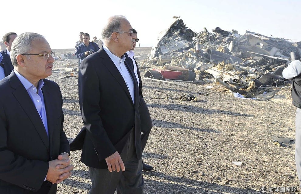 埃及總理伊斯梅爾(Sherif Ismail, 左二)和旅遊部長沙祖(Hisham Zaazou, 圖左)看著墜機的殘骸,這裡是西奈半島阿里什市(El Arish city),31號這天一架俄國科加雷姆航空(Metrojet)的飛機在飛往俄國途中,墜落在西奈半島的山區,機上 224人全數罹難。
