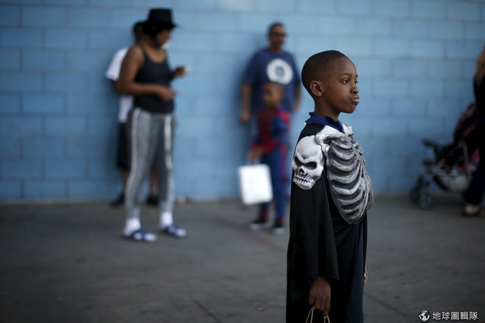 穿著骷髏裝的小男孩等著上街參加萬聖節遊行。每年的這個時候,洛杉磯的貧民窟都會舉辦萬聖節遊行,邀請住在收容所、汽車旅館、車子裡還有在街上流浪的小孩一起感受萬聖節氣氛。