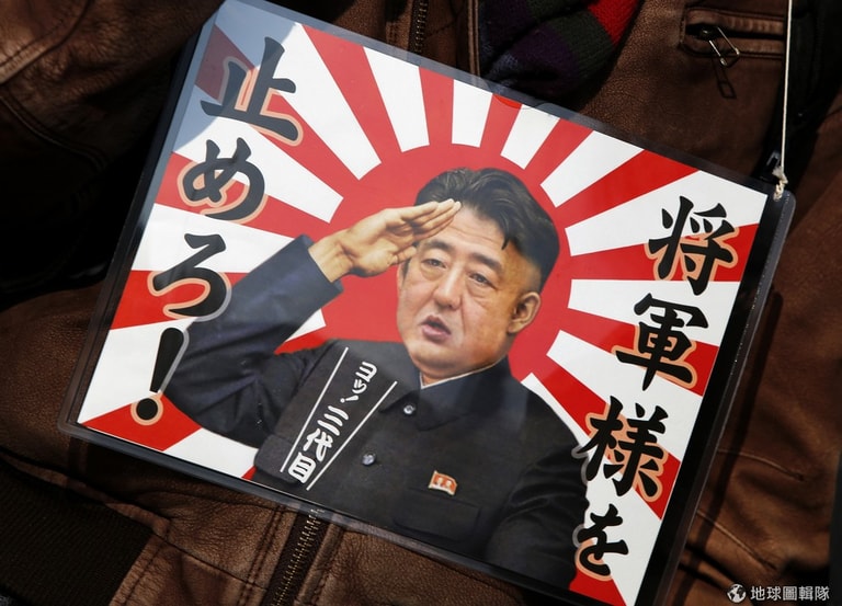 不滿安倍晉三一連串政策的日本民眾,將安倍的臉配上北韓領導人金正恩的髮型還有服裝,一旁的標語寫道:「阻止將軍!」
