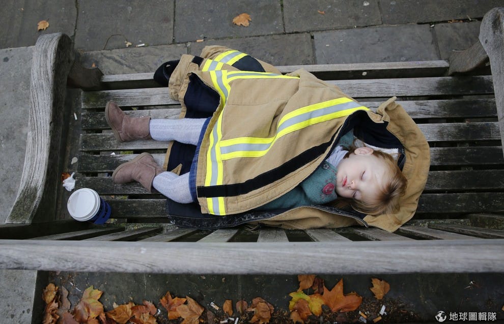 只有 18個月的小瓦茲(Watts)身上蓋著反光外套,睡在國會大廈前的公園長椅上,她的家人是英國消防隊工會的成員,正和其他人一起在國會前抗議新工會法案。示威民眾認為新法案會限縮工會成員的抗議權,讓雇主在工會成員抗議期間聘請員工,降低工會發聲的力道。