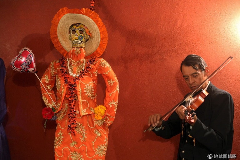 一名小提琴手在打扮得花枝招展的死亡聖神(La Santa Muerte)旁拉小提琴,這是亡靈節慶祝活動的一環,而亡靈節的起源可以追溯到阿茲特克還有馬雅文明的死神,也有人認為亡靈節的傳統來自古歐洲。