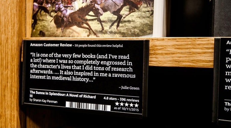 其中一部分的數據包含上百萬名亞馬遜網站使用者對書籍的評價,工作人員會把這些評價和評分標示在實體店面的書架上。此外,亞馬遜書店也將每本書的封面朝上展示,而不是只展示書背。
