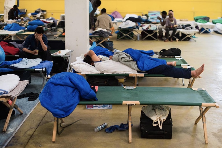 來自敘利亞,阿富汗和科索沃的難民在漢堡展覽中心的一個臨時住宿中心。攝 : Katerina Solovyova/RIA Novosti/AFP/端傳媒提供。