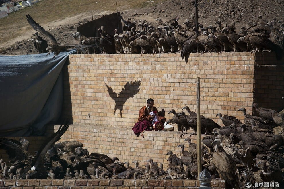 一名藏傳佛教僧侶坐在地上收拾東西,他的身旁圍繞大批禿鷹。這裡是四川省的洛若河谷,海拔高達 3,700-4,000公尺。僧侶們將往生的親友帶來這邊進行天葬,讓禿鷹來吞噬亡者的屍體,認為這是「犧牲自我展現慈悲」的終極體現,也是一種尊敬往生者的方式。除了藏族人會以天葬的方式紀念亡者,蒙古人也會這樣做。