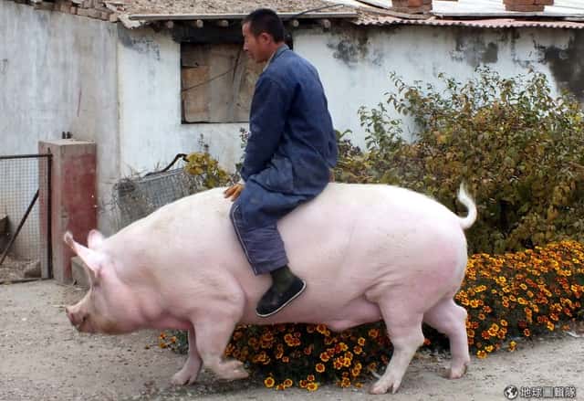 河北省張家口市的農民騎著他養的豬逛大街,身為養豬戶的他決定不把身下的這隻豬送去屠宰場,反而留下牠當寵物養。根據當地媒體報導,這隻豬已經兩歲了,體重則高達 600公斤。