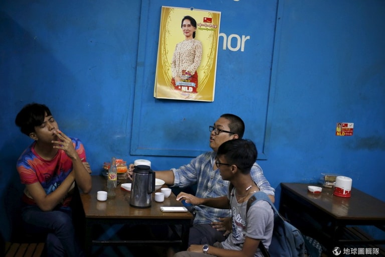 三名男子坐在茶館中,頭上就是緬甸民主的代表人物翁山蘇姬(Aung San Suu Kyi)。這個星期天(8),緬甸將迎接 25年來首場民主大選,緬甸民主象徵翁山蘇姬(Aung San Suu Kyi)將帶領「全國民主聯盟」(National League for Democracy)對抗由前軍政府人員組成的執政黨,不過翁山蘇姬無法參選總統,因為緬甸憲法規定有外籍配偶或子女者不得參選,而翁山蘇姬的丈夫是英國人,進而導致她失去角逐緬甸總統的機會。