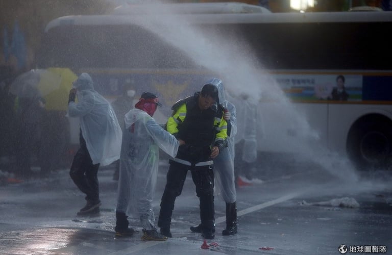 在公車附近,還有警察用強力水柱驅趕試圖爬上牆壁的民眾。