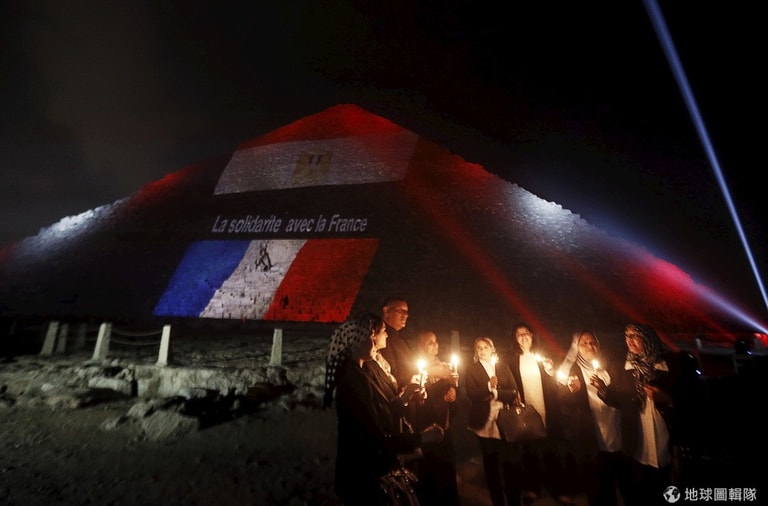 著名的觀光景點吉薩金字塔外,可以見到悼念巴黎恐怖攻擊的燈光打在金字塔外,上方是埃及國旗,中間的投影字寫著「與法國團結一心」,下方是紅白藍三色的法國國旗。
