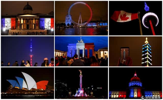 13號巴黎恐怖攻擊後,世界各地從 14號開始點亮建物一同悼念罹難者。圖片中的建物(左上至右上)依序是:倫敦國家美術館、倫敦眼、加拿大國家電視塔;(中間左至右)上海東方明珠塔、柏林布蘭登堡門、台北101;(左下至右下)雪梨歌劇院、墨西哥獨立紀念柱、舊金山市政廳。