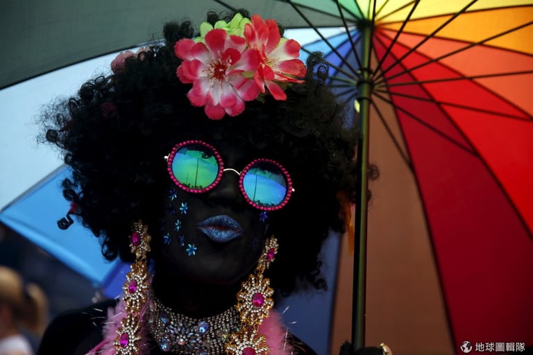 里約熱內盧正舉辦同志大遊行,一位精心打扮的遊行民眾停下腳步接受拍照,他的鏡片反射出科帕卡巴納海灘(Copacabana Beach)的景緻。