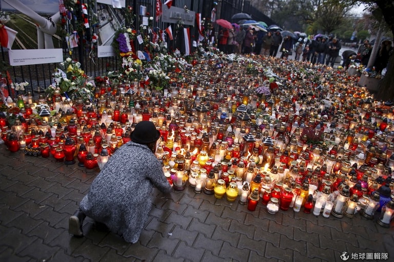 法國駐波蘭大使館外,可見民眾哀悼巴黎恐攻而擺放的點點燭光。