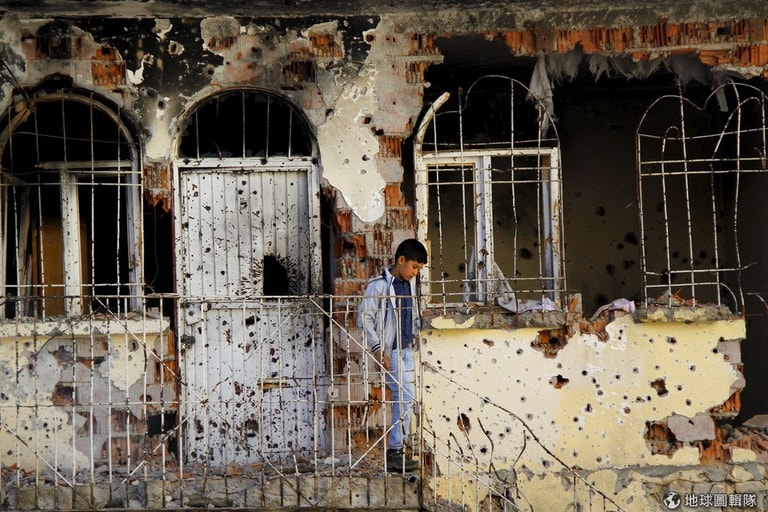 庫德族城鎮夏洛姆(Silvan)當地,一名男孩站在滿是彈痕的建築外,這裡在土耳其政府與庫德族士兵對戰中受到波及。15號這天,夏洛姆當地長達十二天的宵禁暫時解除。