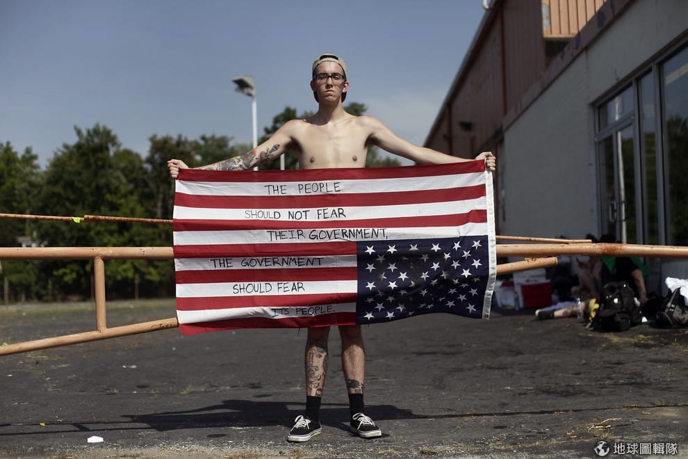 一名白人倒拿美國國旗,抗議美國警察濫殺黑人,國旗上寫道:「人民不該害怕政府,政府應該害怕人民。」