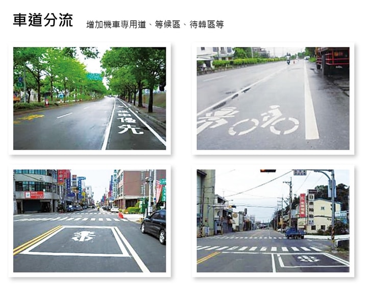 為了讓機車騎士能安全通行,除了運用交通桿和槽化線加強快慢車道分流外,路肩的部分也開始有槽化線出現,防止停車者阻礙騎士。