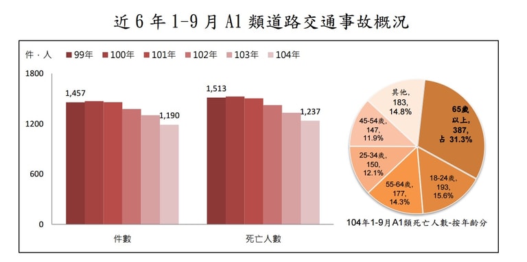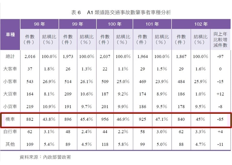 根據交通部最新統計資料, 2015年的事故率再度創下新低紀錄,雖然機車事故致死率占總數比例仍高(占 56.9%),但跟歷年相比已經是新低點。(註:A1類指人員當場或 24 小時內死亡的道路交通事故。)