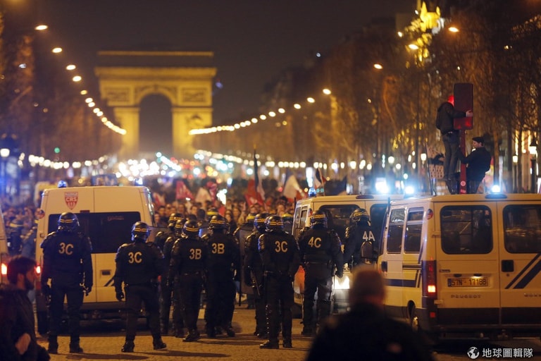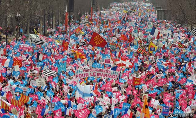 BBC報導,24號周日,法國著名的凱旋門廣場前聚集了數十萬民眾,他們高舉標語抗議即將合法化的同志婚姻和領養法,其中有旗幟寫著「放過我的親子關係」、「我們要的是工作,不是同志婚姻」。抗議活動中也數度發生警民衝突,香榭大道上的人群開始失控,法國警方祭出催淚瓦斯和警棍來驅散抗議民眾。PIERRE ANDRIEU/AFP/Getty Images