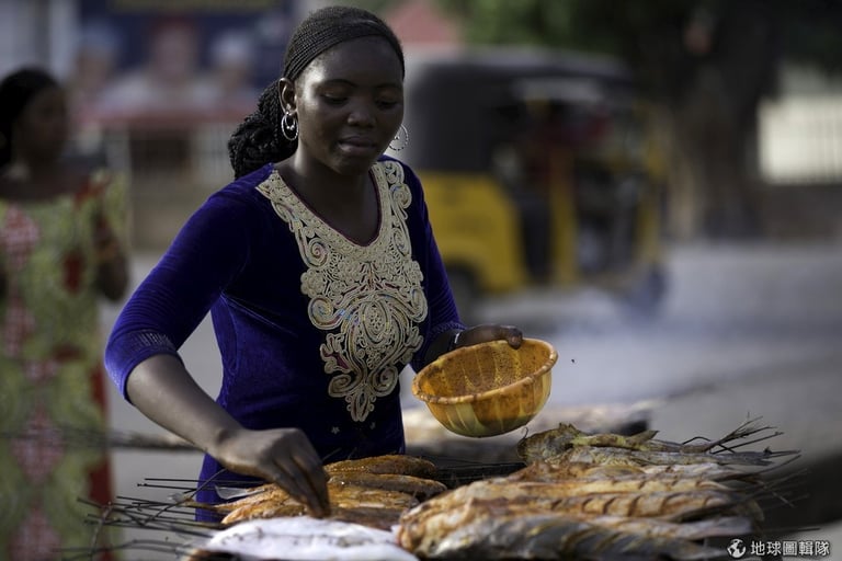 奈及利亞北部因為宗教因素,女性即使遇到家庭問題也不能問。圖為一名正在烤魚的奈國女性。