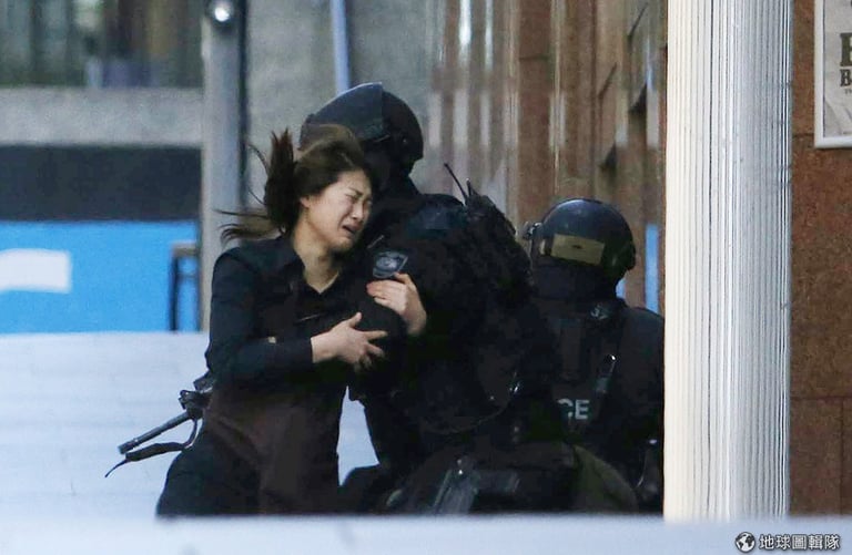2014年12月15日,一名持槍的伊斯蘭男子在雪梨的咖啡店挾持人質,經過 16小時的警匪對峙後,該名槍手遭雪梨警方擊斃,另有2位民眾不幸喪生。圖為當時逃出的民眾舉高雙手。